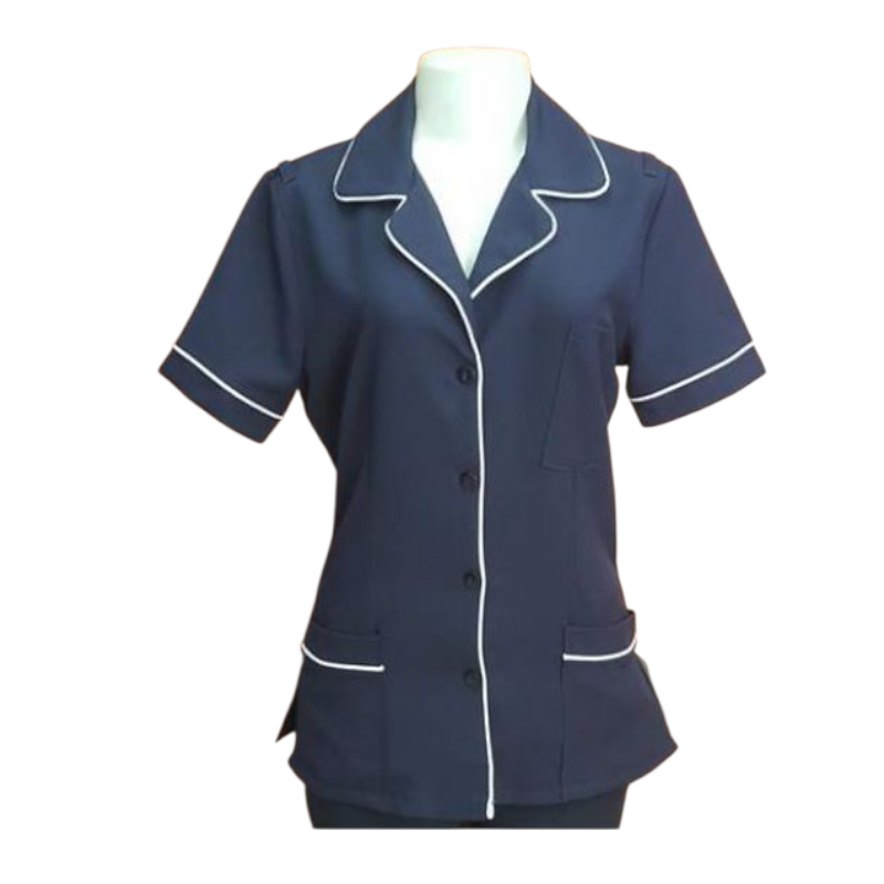 Nurse Shirt button down lb464. The top has a classic collar with a V-neck opening and a buttoned front closure with navy buttons.