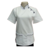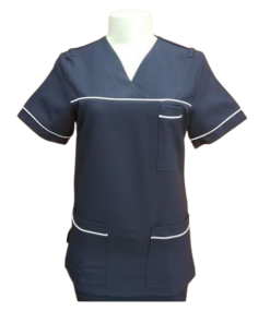 V-neck style with white piping across th chest, on the pockets, and on the sleeve cuffs.