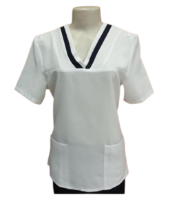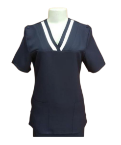 - Contrast color tape on the collar (V-neck) and sleeve hem.